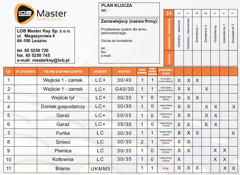 Powyżej w planie klucza przedstawiono przykładowy system, jaki znajduje zastosowanie w domu jednorodzinnym. W systemie tym jest jeden klucz centralny, który otwiera wszystkie drzwi/pomieszczenia w systemie (znaki "X" we wszystkich wierszach). Następnie struktura dostępu składa się z kluczy